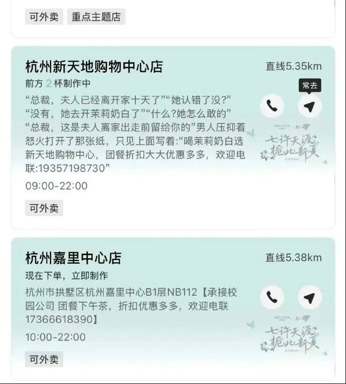 不仅是在小票上做文章,茉莉奶白小程序点单系统中的门店介绍也玩起了网文梗,如“离家十天的总裁夫人开起了茉莉奶白店”“遭手下背叛的特种兵王隐姓埋名在茉莉奶白当店员”“重生归来的嫡女对茉莉奶白念念不忘”等等,可谓将强取豪夺、重生复仇、追妻火葬场等各大热门网文梗统统搬到了小程序点单页。
