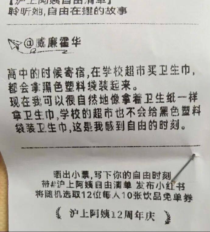 相比于K22酸奶草莓和茶颜悦色,沪上阿姨的“小票文学”明显高明了许多。七月份,迎来十二周年庆的沪上阿姨推出“她,自由在握”主题活动,其中便包含在点餐小票上“聆听她,自由在握的故事”这一创意营销,品牌将消费者分享的“自由时刻”打印在了小票上,并在小红书发起了#晒小票,写下你的自由时刻#的话题活动,推动社区讨论裂变。
