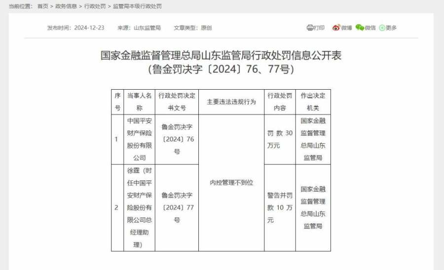 与此同时,“鲁金罚决字〔2024〕77号”行政处罚决定书显示,徐某(时任中国平安财产保险股份有限公司总经理助理)因“内控管理不到位”,国家金融监督管理总局山东监管局对其作出警告并罚款10万元的行政处罚决定。