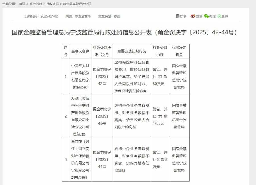2025年7月2日,据“甬金罚决字〔2025〕42号”的行政处罚文书显示,平安产险宁波分公司因“虚构保险中介业务套取费用、财务业务数据不真实、给予投保人合同以外的利益、承保异地责任险业务”等问题,国家金融监督管理总局宁波监管局对其作出警告,并处罚款80万元的行政处罚决定。