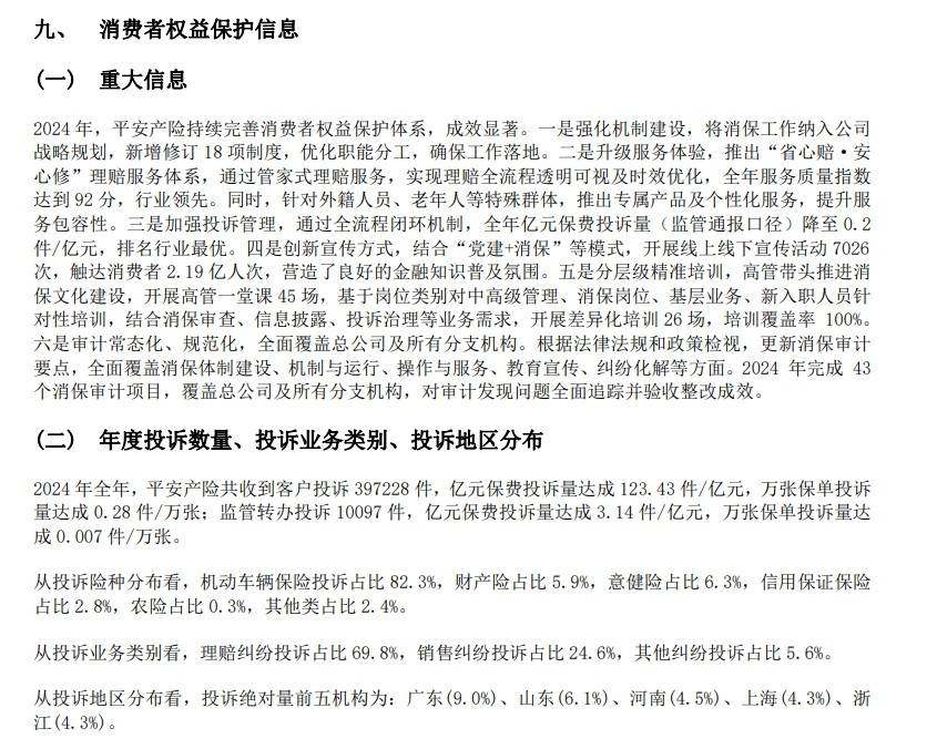 如果说行政处罚是监管对平安产险合规问题的直接打击,那么客户投诉则是市场对其服务质量的间接否定。天眼查App显示,根据平安产险2024年度信息披露报告,全年共收到客户投诉397228件,其中由监管部门转办的投诉就达10097件。亿元保费投诉量高达123.43件/亿元,远超行业平均水平。