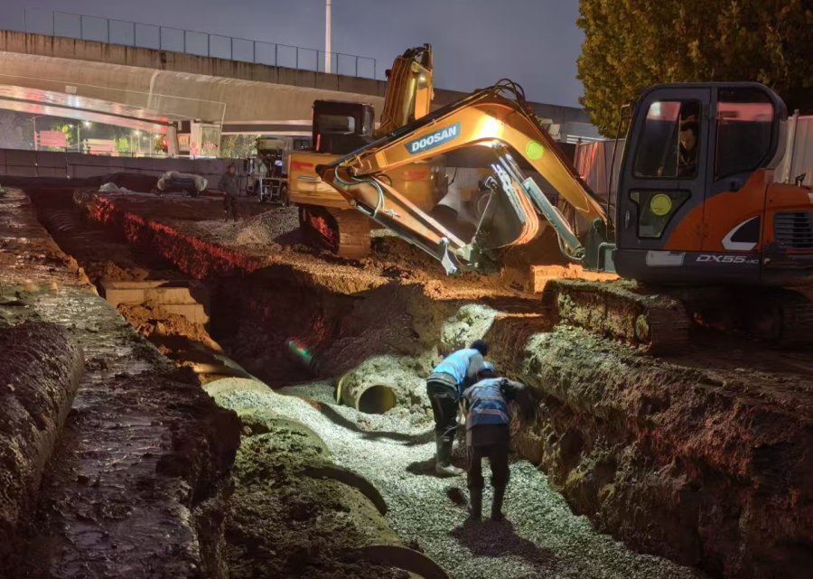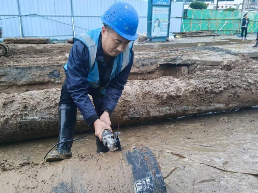 “加快清障,精准对接!”抢修队员迅速分工,一组人继续用抽水泵清理作业区积水,中雨还在不断落下,刚抽走的积水很快又会有所回升,大家只能加快操作节奏;另一组人顶着雨搭建临时作业棚,熟练地切割受损管道、测量尺寸,“用户还等着做饭、洗衣,咱们快一点,大家就能早一点用上水!”抢修人员的话语朴素却坚定,冻得通红的双手紧紧握着工具,动作丝毫没有放缓。
