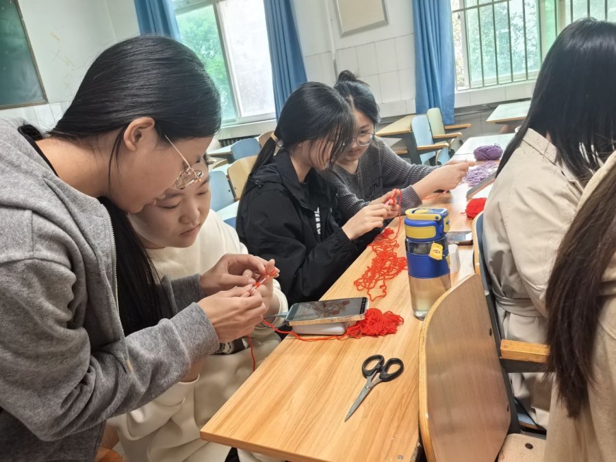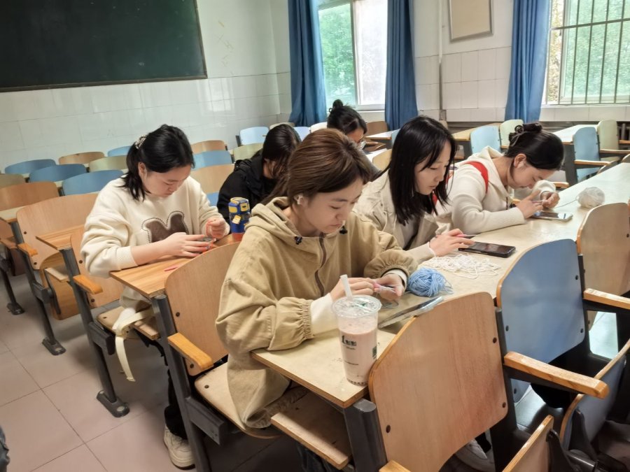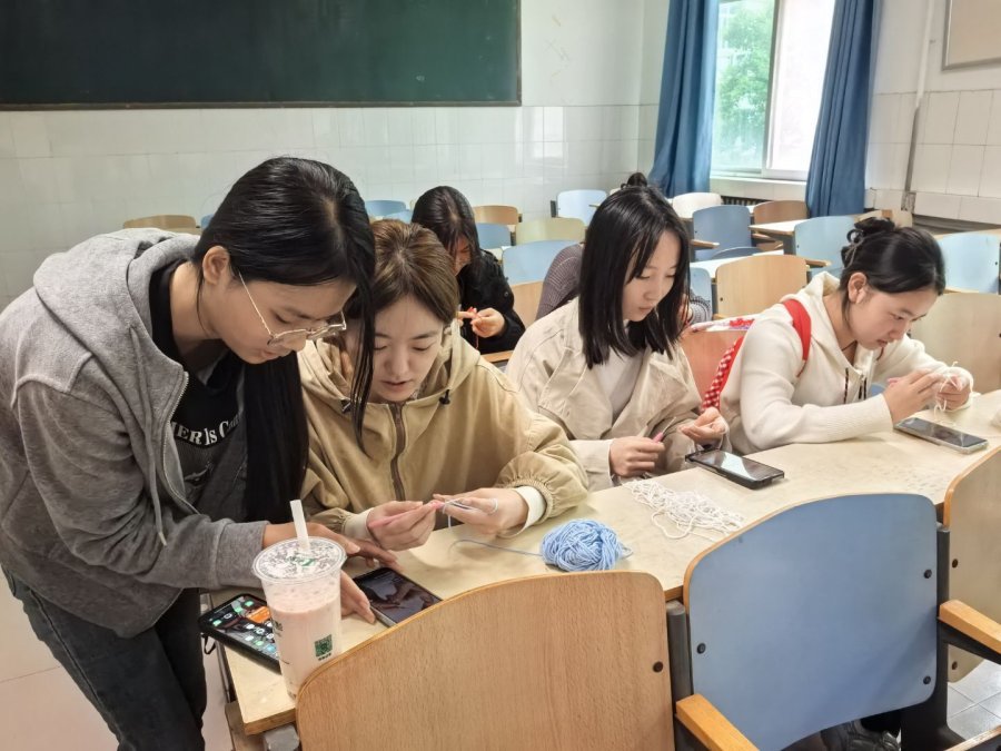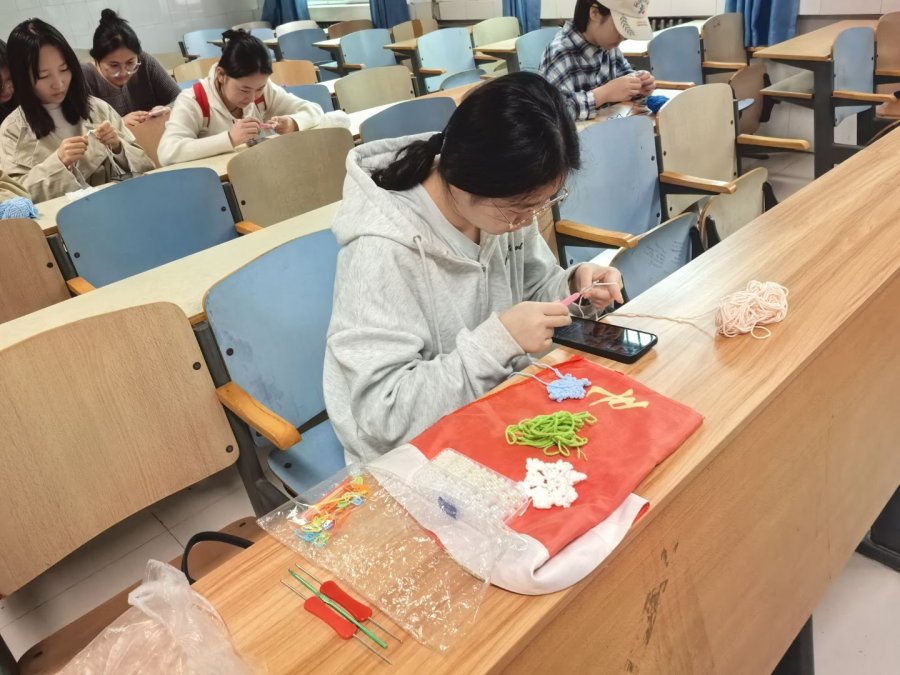 从最基础的握针姿势、绕线方法,到逐步掌握“锁针”、“短针”等针法,初学者们在同伴的耐心指导下很快度过了最初的生涩期。指尖翻飞间,一根根简单的毛线开始初具雏形,逐渐变成一朵朵可爱的小花、一颗颗精致的爱心,或是一条条充满生命力的小鱼。空气中弥漫着毛线的柔软触感与同学们专注而愉悦的交流声。