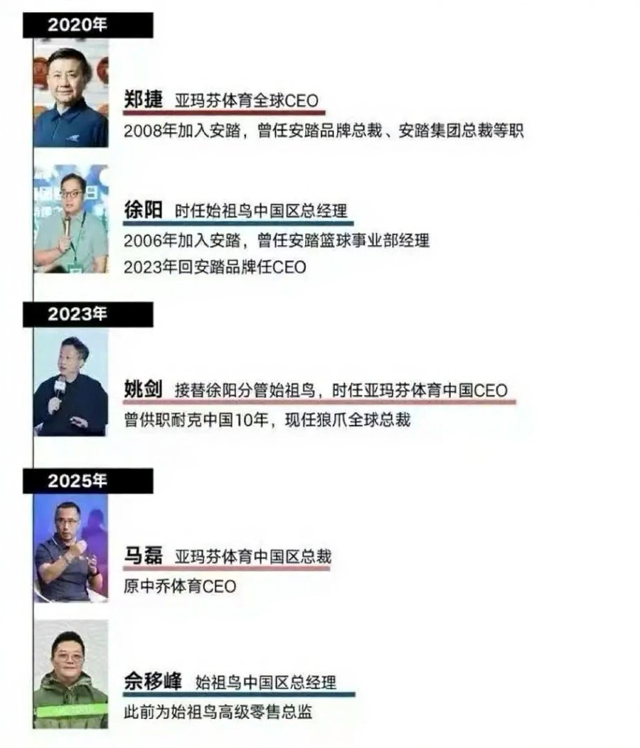 公开履历显示,佘移峰是安踏资深高管,拥有多年零售经验。安踏2018年联合腾讯收购亚玛芬后,他曾担任始祖鸟中国首任总经理徐阳的副手,主抓零售业务,并于2025年初升任大中华区总经理,任期仅不足一年。