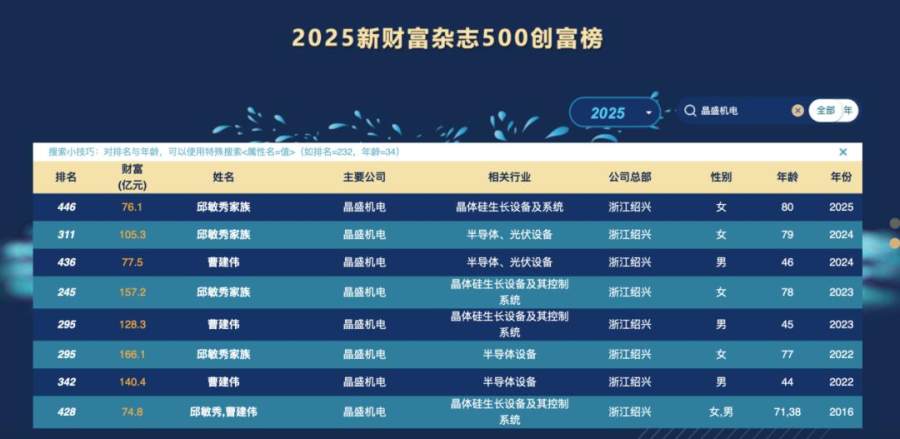 当前,在行业周期性调整的大背景下,作为国内光伏设备领域的龙头企业,晶盛机电正经历着转型阵痛。而这一困境也直接传导至公司实控人层面,邱敏秀与曹建伟的财富规模均受到显著冲击。