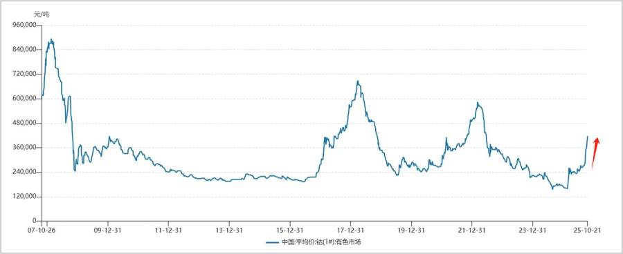 一系列调控动作之下,钴价一飞冲天,开启新一轮大周期。截至10月21日,国内钴价已飙至41.7万元,较本轮低点累涨160%以上。