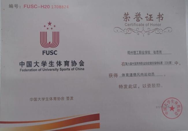 在指导学生参赛时,范杰老师更是“全方位护航”。2021 年指导学生参加第六届中国高等职业院校健美操锦标赛(线上云比赛)期间,她不仅每天陪学生打磨动作细节,还关注学生的饮食与休息,赛前为学生做心理疏导,缓解紧张情绪。最终,学生团队不仅展现出精湛的技艺,更以良好的精神风貌荣获“体育道德风尚运动员”称号,这份荣誉的背后,离不开范杰老师细致入微的关爱。