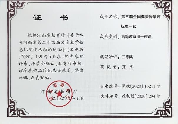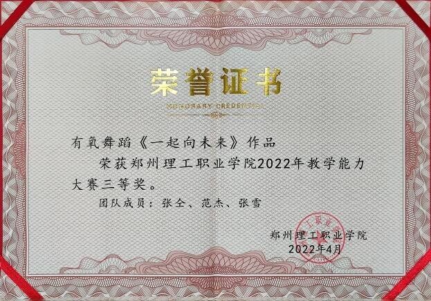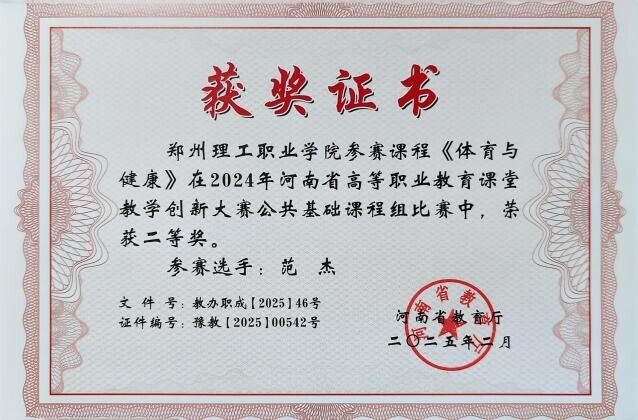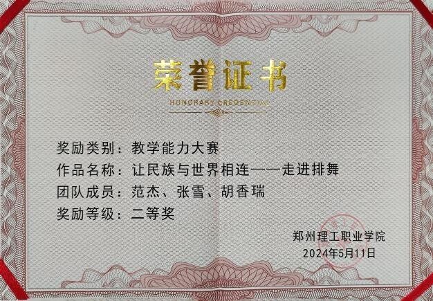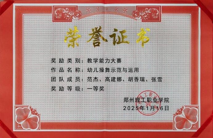 在教学能力竞赛的赛道上,范杰老师不断挑战自我,实现阶梯式成长。2022年,她首次参加郑州理工职业学院教学能力大赛,面对其他学科教师的竞争,她结合体育学科特点,精心设计“运动技能+健康知识”的教学方案,打磨教案与演示视频,最终荣获三等奖;2024年,她总结经验,将信息化教学手段与体育课堂深度融合,在教学设计中加入运动体验环节,凭借创新的理念与扎实的功底,斩获校级教学能力大赛二等奖;2025年,她进一步优化教学方案,以“幼儿操舞示范与运用”为主题,整合多年教学经验,最终摘得校级教学能力大赛一等奖。