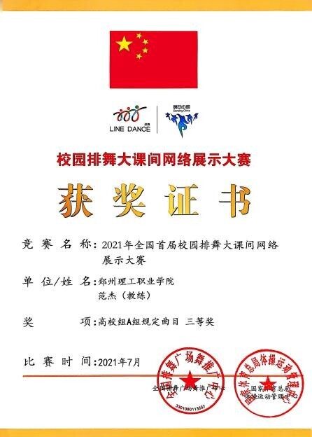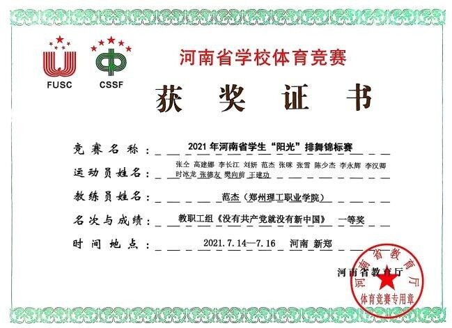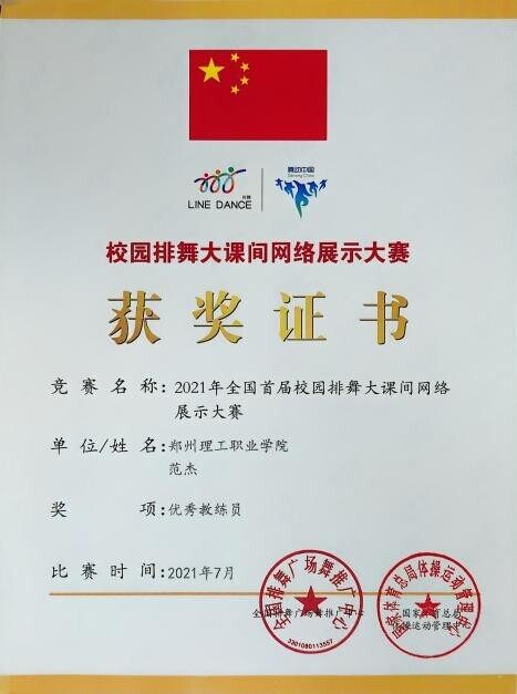 作为健美操项目的核心组织者与指导者,范杰老师不仅带领学生出彩,更牵头组建教职工队伍征战省级赛场,为校争光。2021年暑期,为备战省教育厅主办的阳光排舞锦标赛教职工组比赛,她主动放弃假期休息,全程在校统筹训练工作——考虑到教职工日常教学、行政工作繁忙,她特意将训练时间安排在中午与傍晚,避开工作时段;遇到部分教职工因动作记忆慢产生焦虑时,她还会利用休息时间单独辅导,用“循序渐进、团队互助”的理念鼓励大家坚持。暑假训练期间从队形编排的调整优化,到音乐节奏的精准把控,再到服装道具的统一协调,每一个细节她都亲力亲为。最终,在她的带领与团队的共同拼搏下,学校教职工排舞队在河南省阳光排舞锦标赛中脱颖而出,斩获教职工组一等奖,为学校赢得了荣誉。