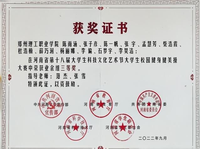 此外,她指导学生参赛同样成果丰硕。2021年7月,指导学生参加全国首届校园排舞大课间网络展示赛时,从动作编排、音乐选择到视频录制,她全程把关,带领学生利用课后、周末反复排练,逐帧修改录制视频,最终因出色的指导能力被评为“优秀教练员”;2022年5月,指导学生参加河南省第十七届大学生科技文化艺术节体操类比赛,针对学生动作不规范的问题,她手把手纠正细节,陪学生加练至深夜,最终帮助学生获得三等奖。