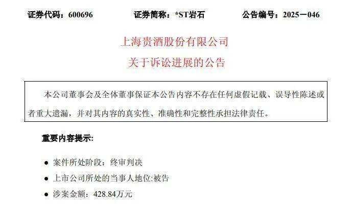 10月10日,上海贵酒股份有限公司(证券简称:ST岩石,股票代码:600696.SH,以下简称“岩石股份”)披露诉讼终审判决,因侵害贵州贵酒集团商标权及不正当竞争行为,被判赔偿418.85万元并立即停用“贵酒”企业名称。
