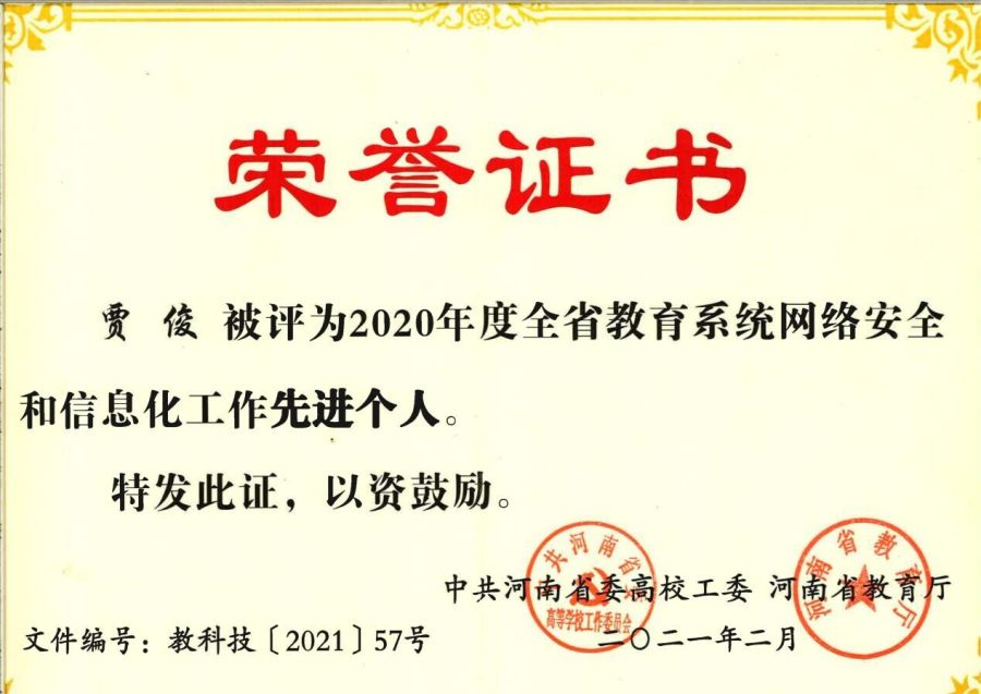 贾俊的工作业绩不仅校内屡获肯定,多次被评为“先进教育工作者”与“优秀共产党员”,而且获得了省级认可,2020年与2022年两度获评“全省教育系统网络安全和信息化工作先进个人”。这份从技术深耕到管理创新的跨越,既见证了他十二年的成长轨迹,也坚定了他未来前行的方向。他将一如既往,以技术为笔,以管理为墨,继续在他热爱的这片理工热土上,描绘更加智慧、安全、便捷的数字新蓝图。