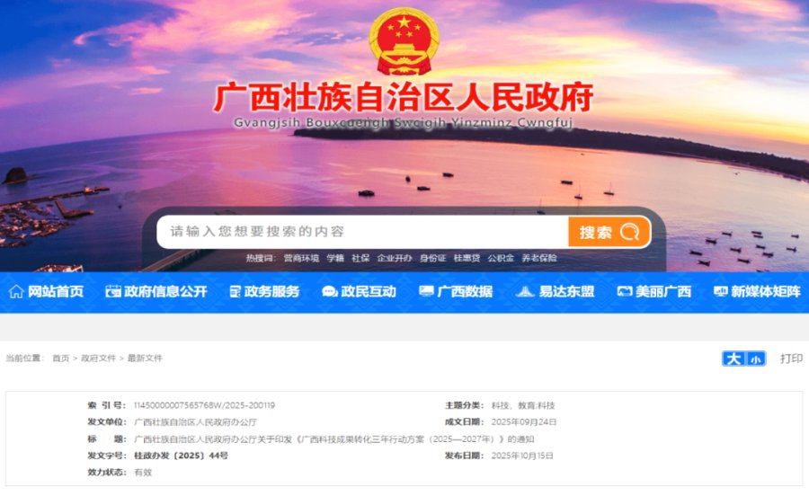10月15日,广西壮族自治区人民政府办公厅发布《广西科技成果转化三年行动方案(2025-2027年)》(以下简称《行动方案》)。《行动方案》指出实施科技成果转化“双向揭榜”,支持采用“双向揭榜”机制,推动企业和高校、科研院所精准对接,高效转化重大科技成果;支持企业找技术,采用“企业出题、政府立项、揭榜挂帅”方式,按揭榜金额25%的比例择优给予支持,最高不超过1000万元;支持成果找市场,对高校、科研院所单项到位经费超过100万元的横向科研项目,经报自治区科技厅备案后,以自治区本级自筹经费科技计划项目下达,验收通过后可申请企业购买科技成果转化后补助;发展科技成果转化基金,落实“投早、投小、投长期、投硬科技”的要求,围绕发展新质生产力建设科技成果转化基金群,为种子期、初创期、成长期科技型中小企业提供股权投资,实施一批“先投后股”、“拨投结合”成果转化项目,科技计划资金和科技成果转化基金协同支持重大科技成果转化;布局建设概念验证中心,支持重点高校、科研院所、产业园区和龙头企业建设概念验证中心,为早期科技成果提供原理验证、技术验证、产品验证、市场验证等服务。(来源:广西壮族自治区人民政府办公厅)