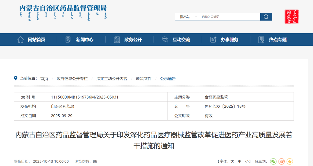 10月13日,内蒙古自治区药品监督管理局发布《深化药品医疗器械监管改革促进医药产业高质量发展若干措施》,围绕核酸药物、细胞和基因治疗、“AI+医药”、高值医用耗材等特色赛道,联合自治区工信、科技等部门,支持生物医药高新技术企业、孵化平台等落地建设。提出优化药械注册审评审批服务机制,综合临床价值、技术创新等因素,建立“重点产品服务清单”,对纳入清单的产品实行“提前介入、一企一策、全程指导、研审联动”,优先进行产品检验、现场检查和GMP符合性检查,并建立常态化沟通交流机制,为企业提供个性化精准化政策和技术服务;制定实施《内蒙古自治区第二类创新医疗器械特别审查程序》;鼓励区外第二类医疗器械产品转入我区注册,在原注册证尚在有效期、产品无实质改变且产品检验合格的前提下允许使用部分原注册申报资料在区内申请注册;深化区域监管协同,深入推进东北三省一区、西北五省区、“6+1”等区域药品医疗器械监管信息互通、资源共用、力量互补、结果互认。(来源:内蒙古自治区药品监督管理局)