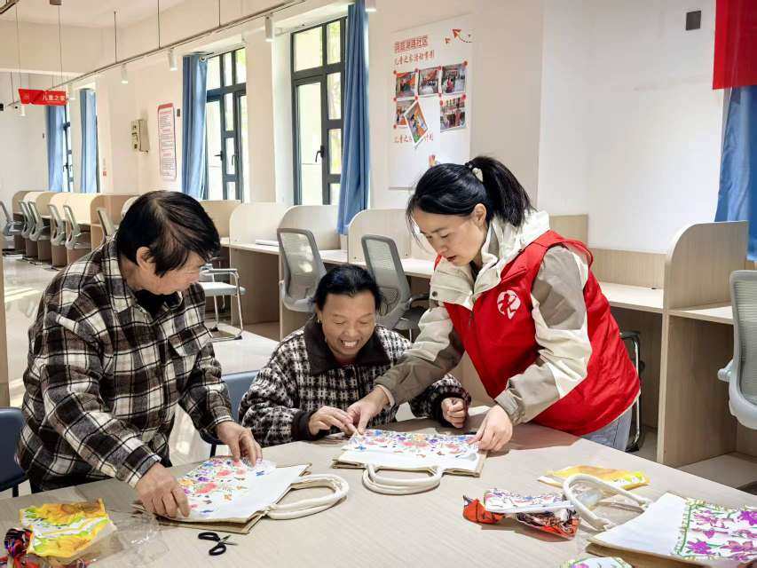 活动当天,社区党群服务中心暖意融融。社工提前备好素色托特包、花纹布料、安全胶水、剪刀和画笔等手工材料,带领老人们开启布艺贴画创作之旅。现场,社工细致讲解技巧:“剪向日葵花瓣时,边角修得圆润些,会更饱满生动。”分享色彩搭配心得:“深色底布配亮色花纹,整体效果更鲜明。”同时逐步演示粘贴步骤,贴心提醒:“涂胶要薄而匀,粘好后轻压半分钟更牢固。”