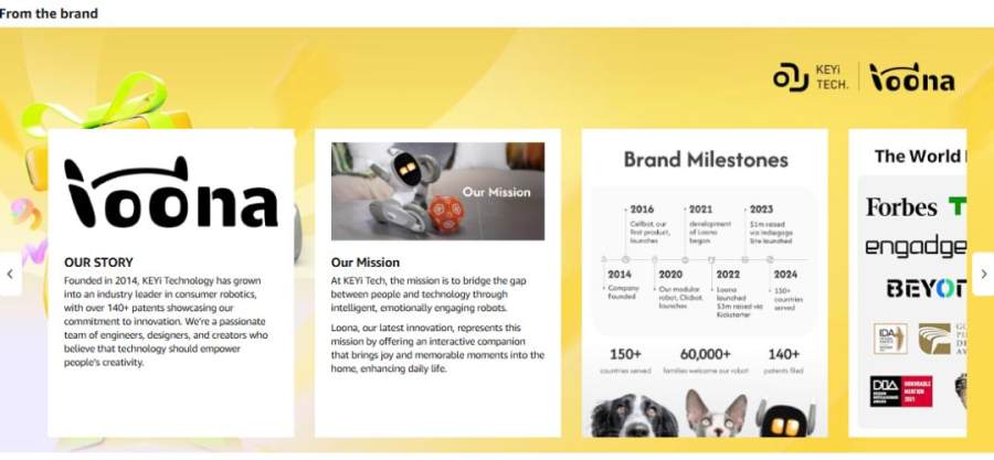 此外,通过亚马逊的“品牌故事”工具,Loona在向用户展现自己的技术能力同时,也传达了其“通过智能且富有情感互动的机器人,弥合人与科技之间的鸿沟”的使命,让用户更直观的理解品牌背后的故事和理念,进一步加深了对品牌的认同和情感链接。
