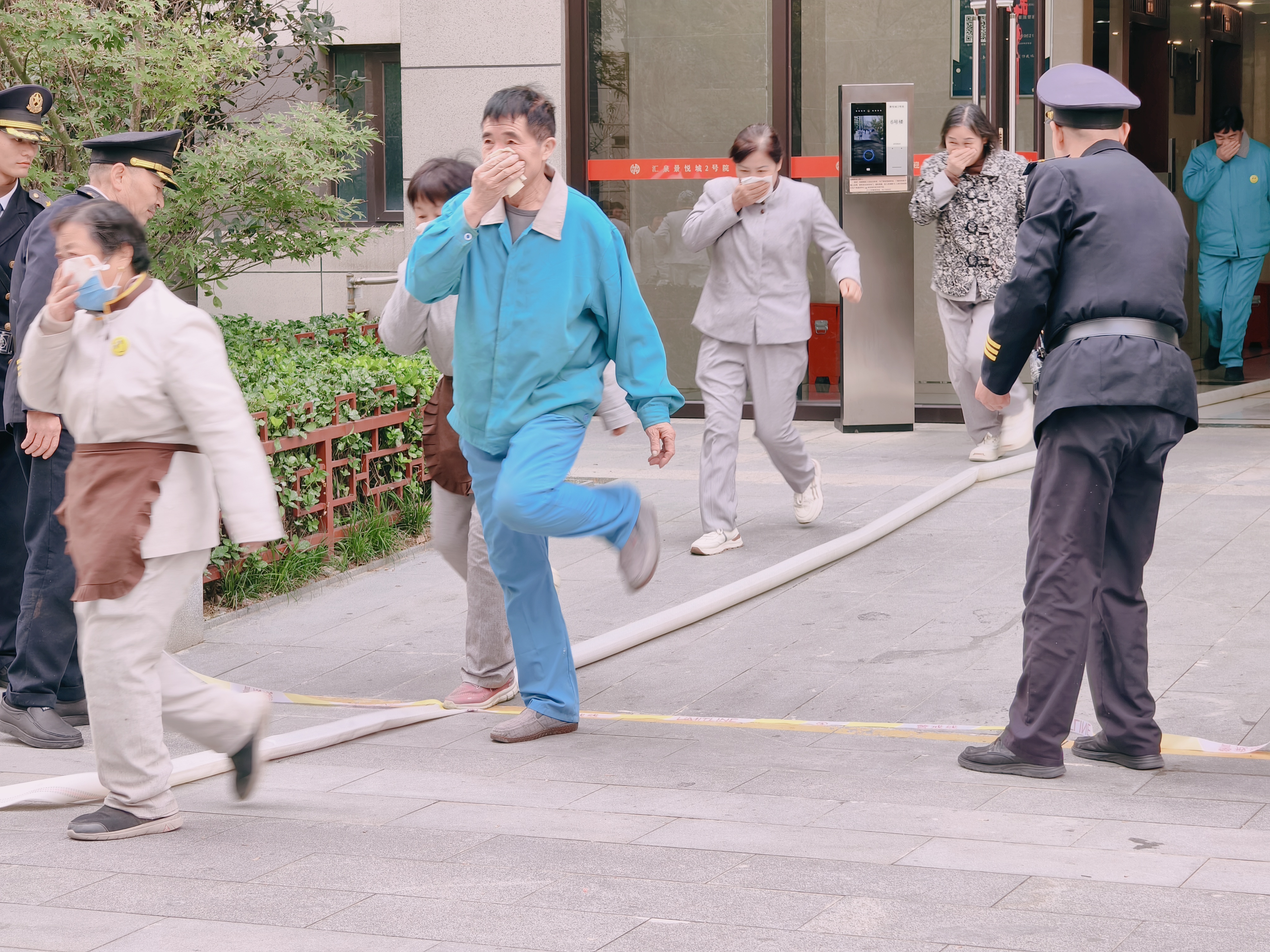 理论讲解结束后,实战演练随即展开。模拟小区楼道 “起火”,浓烟迅速蔓延,在消防队员的指挥下,工作人员用湿毛巾捂住口鼻,弯腰低姿,沿着安全出口快速有序疏散至小区广场,整个过程紧张有序。随后,物业人员在消防员指导下亲自操作灭火器,对准 “火点” 成功扑灭火焰,将理论知识转化为实战技能。