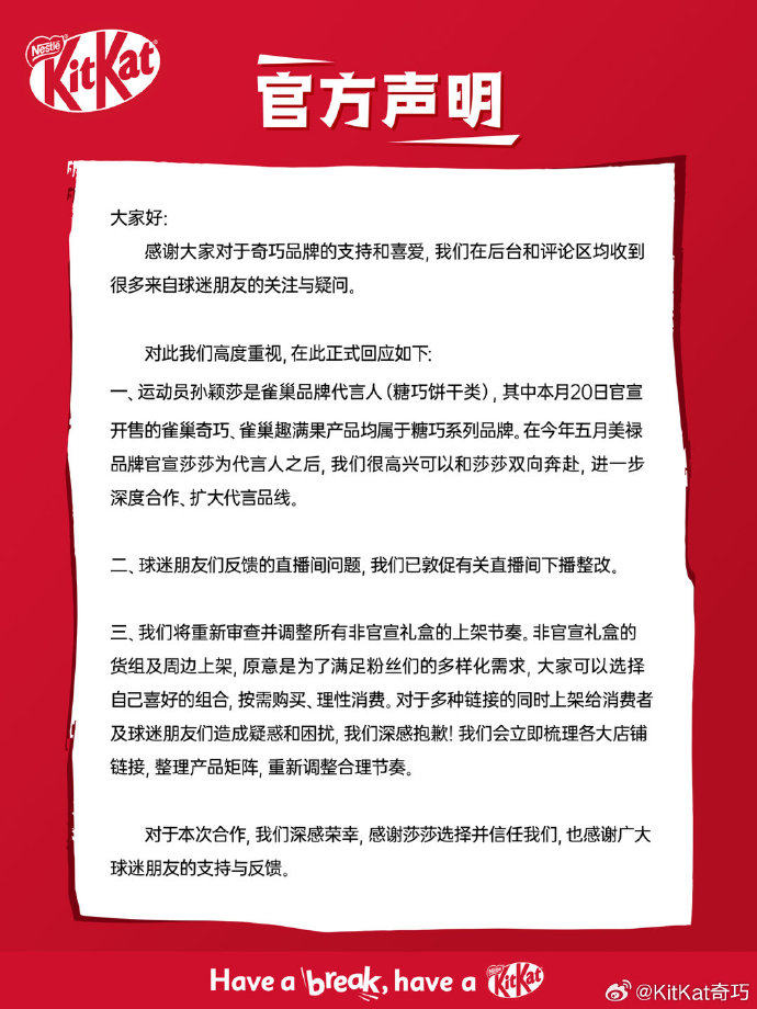 10月21日,@KitKat奇巧官方微博发布声明,就直播间问题向球迷道歉,引发行业对顶流代言营销规范的关注。