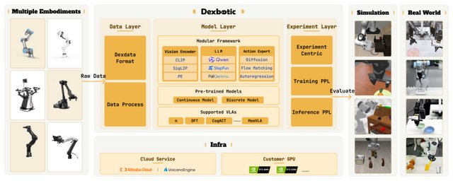 数据层负责整合和标准化多构型本体的数据,将来自不同机器人平台的原始信息统一转化为Dexdata格式。这一格式兼容UR5、Franka、ALOHA等多种真实机器人及多视角输入,使得不同实验之间的数据能够无缝互通;模型层汇聚了包括Pi0、MemoryVLA在内的多种主流VLA算法,为研究者提供标准化的实现和统一的接口,方便在同一框架下进行复现、比较与扩展,而实验层则是整个系统的中枢,承担快速开发与部署的功能。它既支持在阿里云与火山引擎等云平台上运行,也能在消费级显卡上完成训练与测试,确保模型能够在各类主流仿真环境及真实机器人上稳定落地。