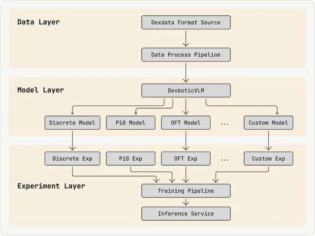 架构上,Dexbotic分为三层:数据层、模型层与实验层。