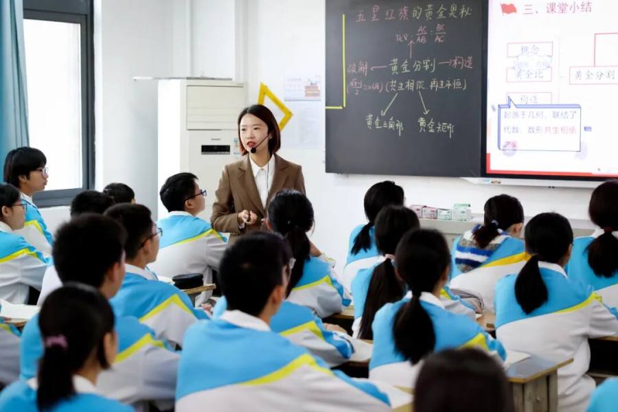 四南校区郑之帆老师借助学生所学比例和相似等知识,以五星红旗为载体,学习了黄金分割的定义,利用转化、方程等思想计算出黄金比,并构造出黄金分割,引导学生体会数形共生相依之美。