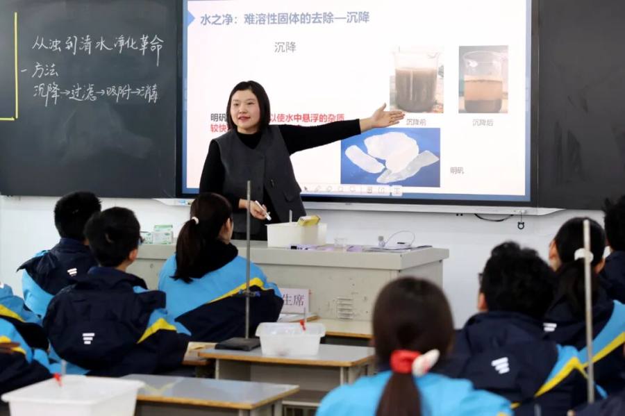 14初级中学王慧敏老师用AI动画代入古今净水情境,依据净化水的方法与步骤为脉络设计教学,引导学生动手实验,共探水净化奥秘。课堂设计巧妙,融合化学学科素养与节水环保意识,激发学生探究欲,提升学生实验探究能力。
