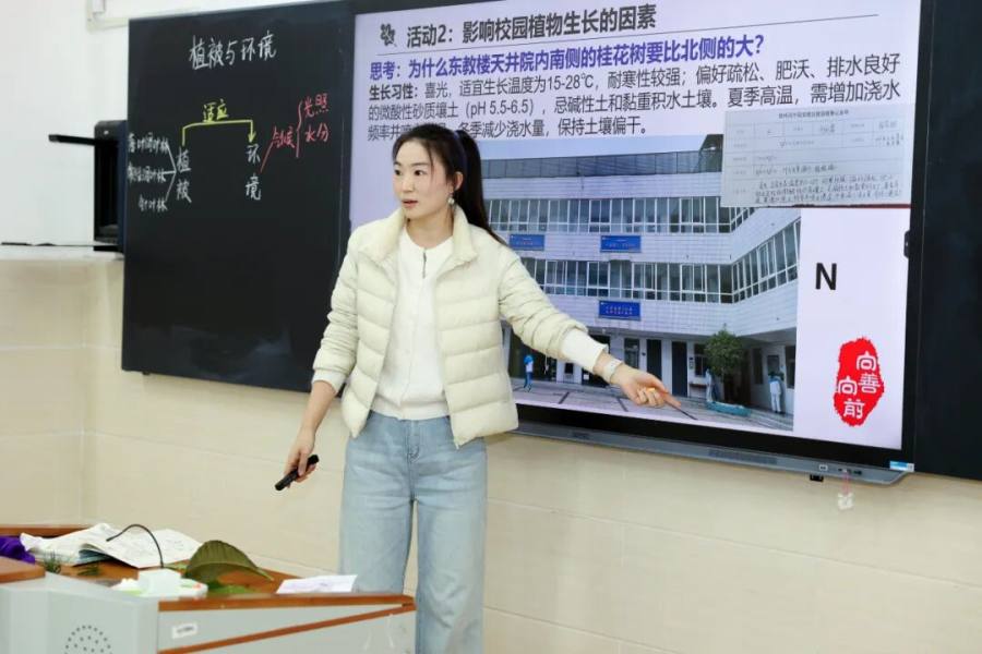 迎宾校区郭君怡老师以校园为天然课堂,引领学生解读叶片语言、探秘植被分布、破译环境密码。学生在自主探索中发现地理魅力,在合作思辨中领悟因地制宜,在实践应用中绽放青春风采。