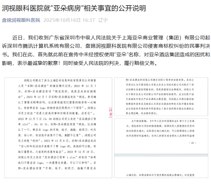 盘锦润视眼科医院在他们医院搞了一个“亚朵病房”,本意是想向患者传递“像住在亚朵一样”的体验承诺,但却忽略了商标保护的边界。