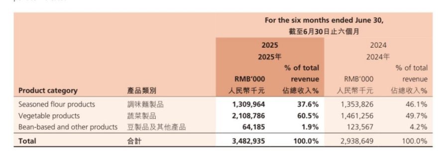 上市之后,卫龙面临的最大挑战是“如何走出辣条”。传统调味面制品的增速趋缓,使魔芋爽成为品牌转型的关键支点。从数据上看,卫龙的结构重心已被彻底重塑:蔬菜制品(以魔芋爽为主)收入从2022年的不足30%跃升至2025年上半年的 60.5%,实现连续两年超40%的增速。与此同时,调味面制品、豆制品及其他产品两个品类的营收总额是同比下降的。