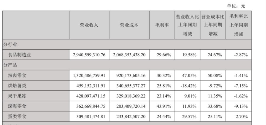 盐津铺子在半年报中披露,魔芋精粉采购均价较上年同期上涨超 30%,导致公司毛利率从 32.53% 下滑至 29.66%。卫龙同样受到原料波动影响,蔬菜制品毛利率由 52.52%降至46.5%。