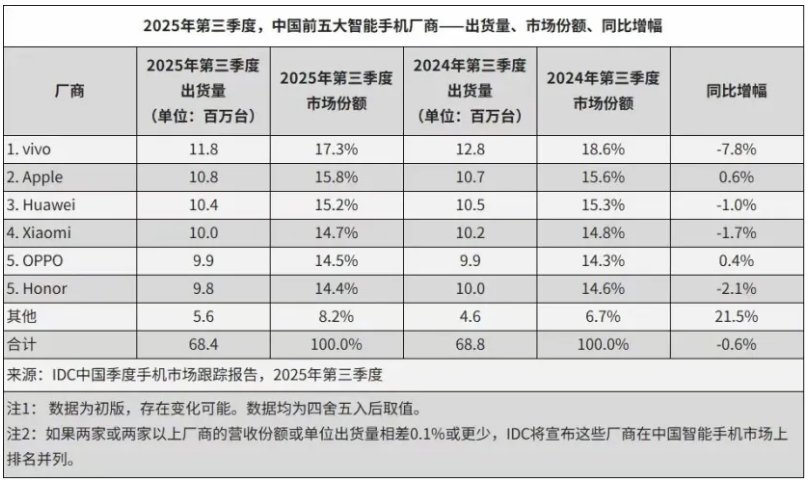 据IDC发布的2025年第三季度中国智能手机出货量数据,在国内市场出货量TOP5品牌中,唯有苹果和OPPO有所增长,分别增长0.6%和0.4%。