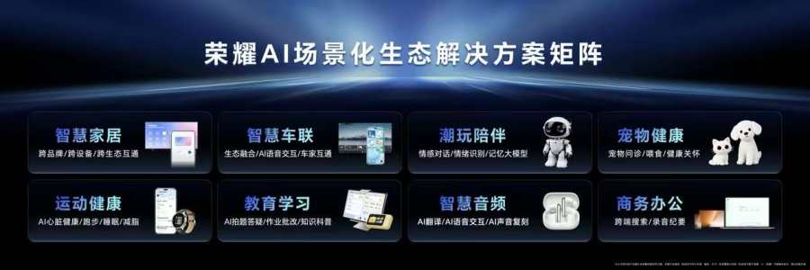 荣耀HONOR AI Connect平台致力于降低生态合作伙伴的接入门槛与研发成本,开发者无需重构复杂基础平台即可直接调用成熟的语音、视觉等多模态交互能力,并享受跨场景AI协同服务。为实现这一目标,荣耀同步推出A系列软硬件一体化模组,覆盖不同算力需求,支持多样化交互方式,可灵活适配多类应用场景,该系列模组也将持续迭代推出新品,以满足未来更广泛的AI生态需求。平台通过“智联”能力的系统化开放,为生态伙伴带来智慧化共享、入口共享与生态共享,真正让每一款硬件快速焕发智慧生命力。 荣耀8大AI解决方案:让AI在每一个细节为用户创造价值为解决用户面对“场景割裂、服务单一”的智能生态时带来的碎片化体验,并攻克行业长期存在的互联互通难题,荣耀基于HONOR AI Connect平台,发布了8大AI场景化生态解决方案,覆盖智慧家居、智慧车联、潮玩陪伴、宠物健康、运动健康、教育学习、智慧音频、商务办公等场景。此次发布的8大AI场景化生态解决方案深度融合软硬件能力,是荣耀构建AI生态的核心引擎。荣耀将把这些解决方案全面向行业开放,携手合作伙伴共同推进更多AI垂直领域的生态共创,打造一个繁荣、开放、持续进化的AI终端生态,全面构建以人为中心的智能生活闭环。
