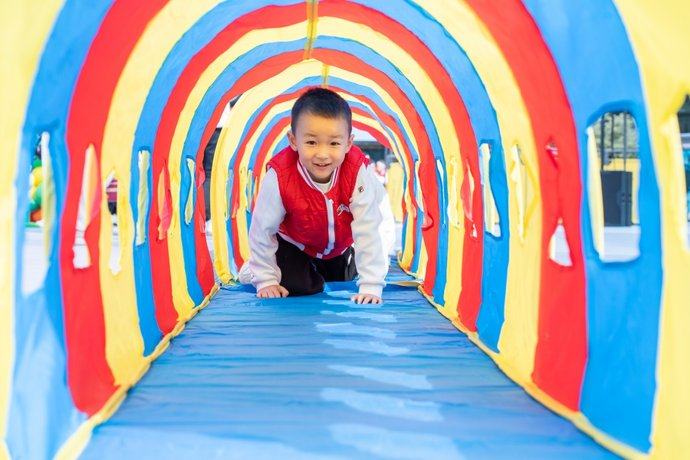 随后,26项适龄体能游戏在各区域同步开展。针对3月龄婴幼儿设计的触感互动游戏、适合低龄段的“钻洞大冒险”、面向学龄前期的“跨栏小飞人”等项目,覆盖走、跑、跳、钻、爬等多元运动形式——既帮助低龄宝宝锻炼感知能力与肢体协调性,又让大龄幼儿提升平衡感与团队协作力,更在亲子互动中传递规则意识,让“养正”理念融入每一个运动瞬间。