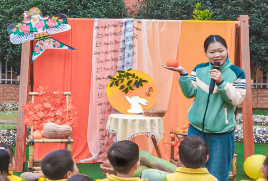 “霜叶红于二月花,霜降柿子红似火”。南充市高坪区青苹果小龙幼稚园的老师化身“节气讲解员”,用充满秋意的食材带领孩子们了解霜降,听老师讲述霜降节气的物候特点与民间习俗。