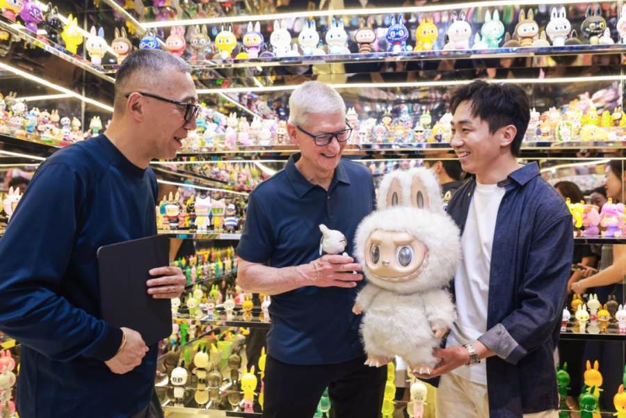 10月13日,库克再度开启中国行,首站便现身LABUBU所属的THE MONSTERS 10周年巡展。在巡展现场,泡泡玛特创始人王宁与LABUBU的设计者、艺术家龙家升一同陪同库克参观。