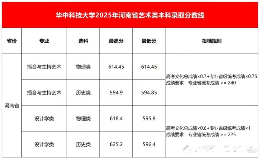 【985】华中科技大学2025年河南省艺术类本科录取分数线