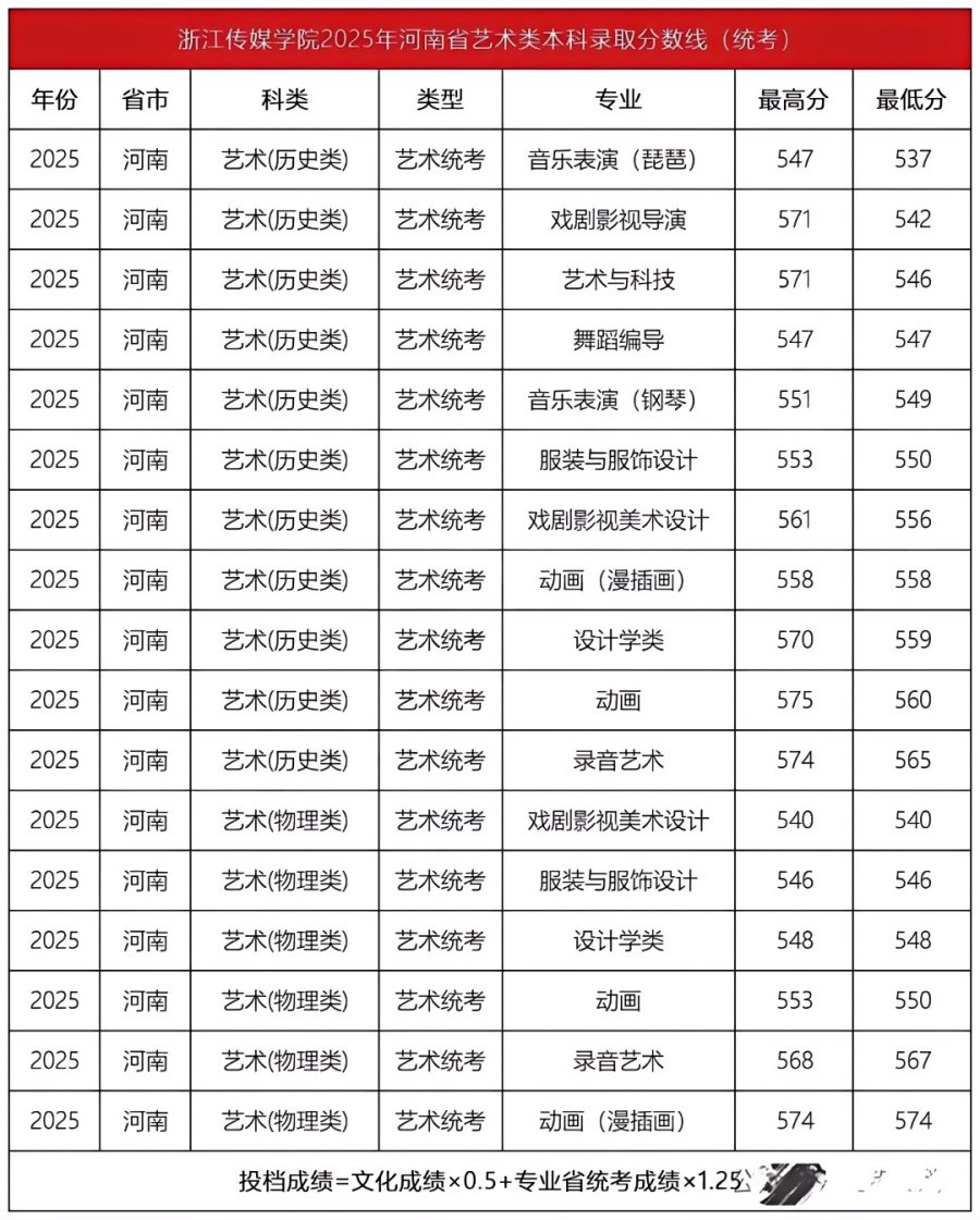 浙江传媒学院2025年河南省艺术类本科录取分数线