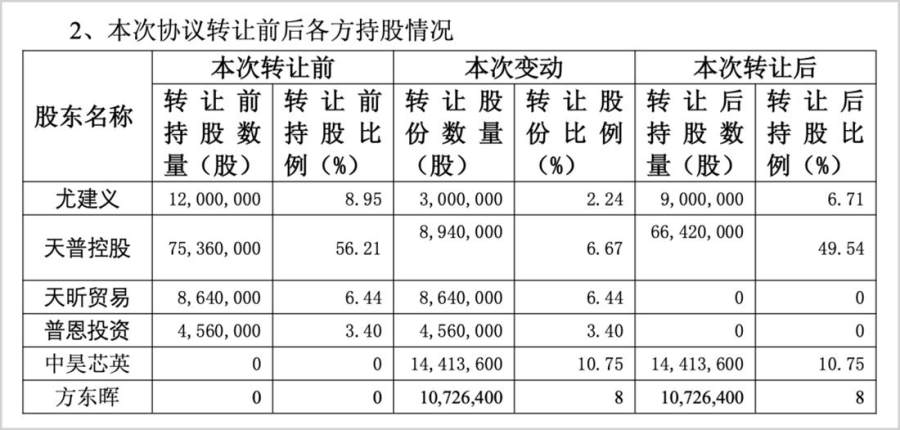 若“两步走”顺利完成,中昊芯英、海南芯繁、方东晖分别持有天普控股30.52%、19.49%、24.99%股权,三者为一致行动人,合计将拿下天普控股75%的股权;叠加直接持股,天普控股、中昊芯英和方东晖最终持有上市公司68.29%股权,杨龚轶凡将替代尤建义成为新控制人。