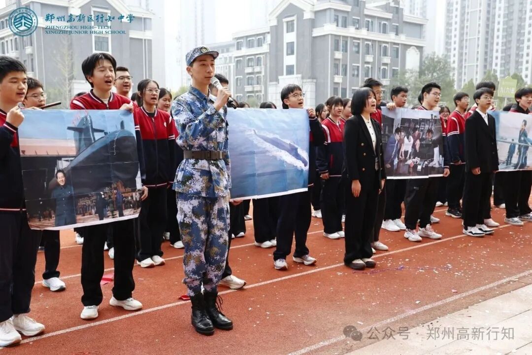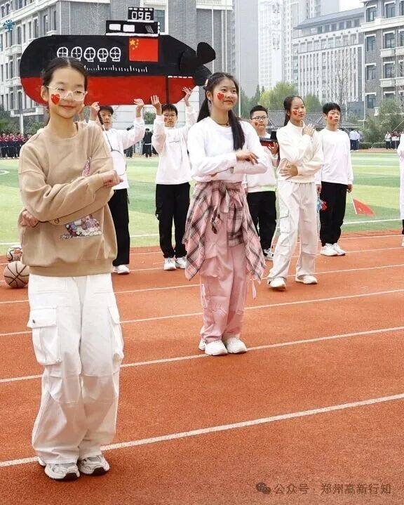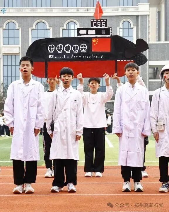 九年级方阵则以“奉献·远航”为主题,展现黄旭华院士将个人理想融入国家事业的崇高境界。同学们通过航母造型、蓝色绸缎模拟海洋等创意形式,演绎“扬帆远航”与“深潜测试”,彰显责任与担当,传递“集体荣誉高于一切”的信念。