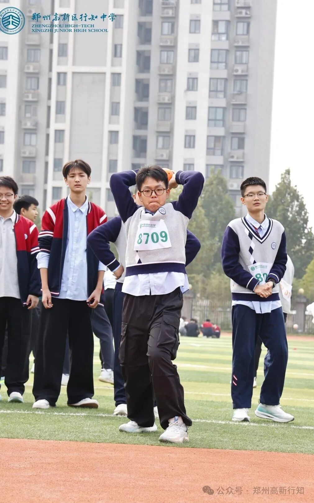 九(3)班郭政晓同学作为运动员代表宣誓,表示将以饱满的热情投入比赛,尊重规则、顽强拼搏,为个人添彩,为集体争光。