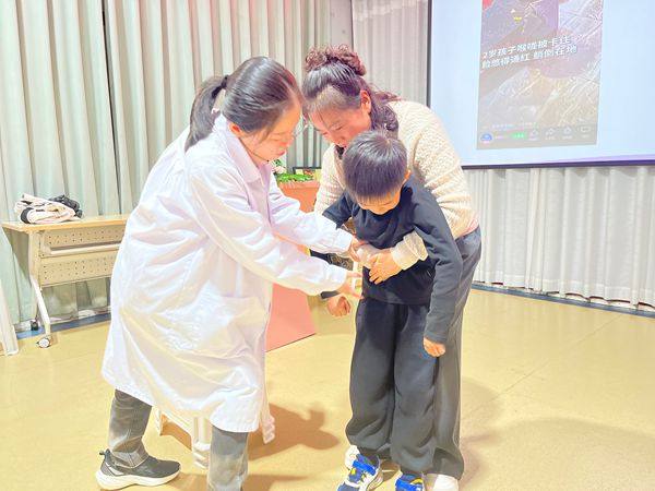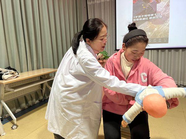 刘媛媛副园长借助PPT,讲解了海姆立克急救法,根据呼吸道异物堵塞的不同情况采取针对性处理措施。他现场演示了婴儿、幼儿、成人呛食的紧急处理方法,并邀请家长和教师上台,在健康副院长的指导下,学习海姆立克法的操作要领和注意事项。