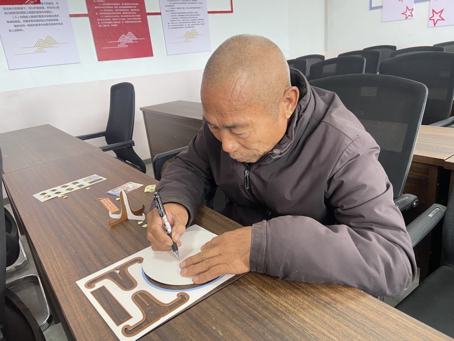 老人在自己的手工作品背面签名留念