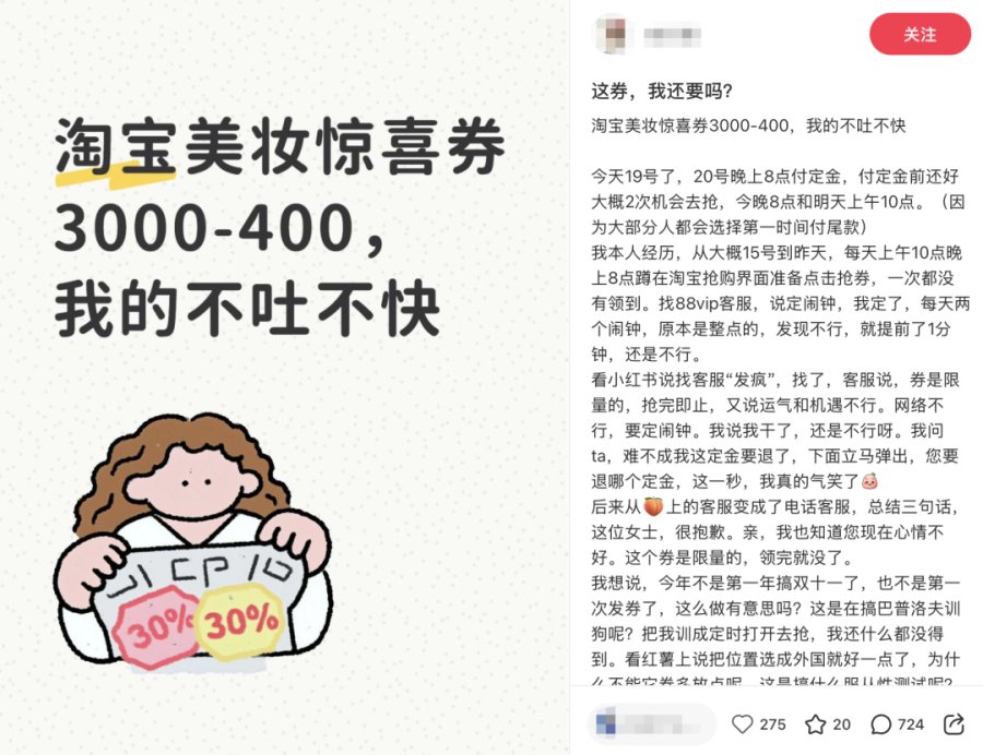另外,“3000减400”的美妆惊喜券也被质疑是平台在搞饥饿营销。有用户在社交媒体直接吐槽“美妆惊喜券比演唱会门票还难抢”,还有网友分享自己抢券未果的心路历程,表示自己从10月15日到10月20日,每天早10点和晚8点蹲在淘宝抢购界面点击抢券,一次都没有领到。后来听从客服建议定闹钟、学习其他网友经验“找客服发疯”,也都没有结果。