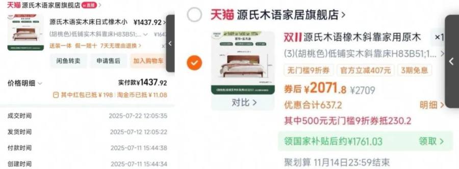 有用户在社交媒体上晒出截图,7月份源氏木语的橡木床售价为1647元,实付款为1437.92元。但眼下双11售价却涨到了2709元,券后价为2071.8元。双11前,云鲸扫地机器人的扫地机器人链接详情页显示活动券后价2641.54元,但是20日晚8点后的补贴后价格就变成了3036.28元,坐地起价近400元。