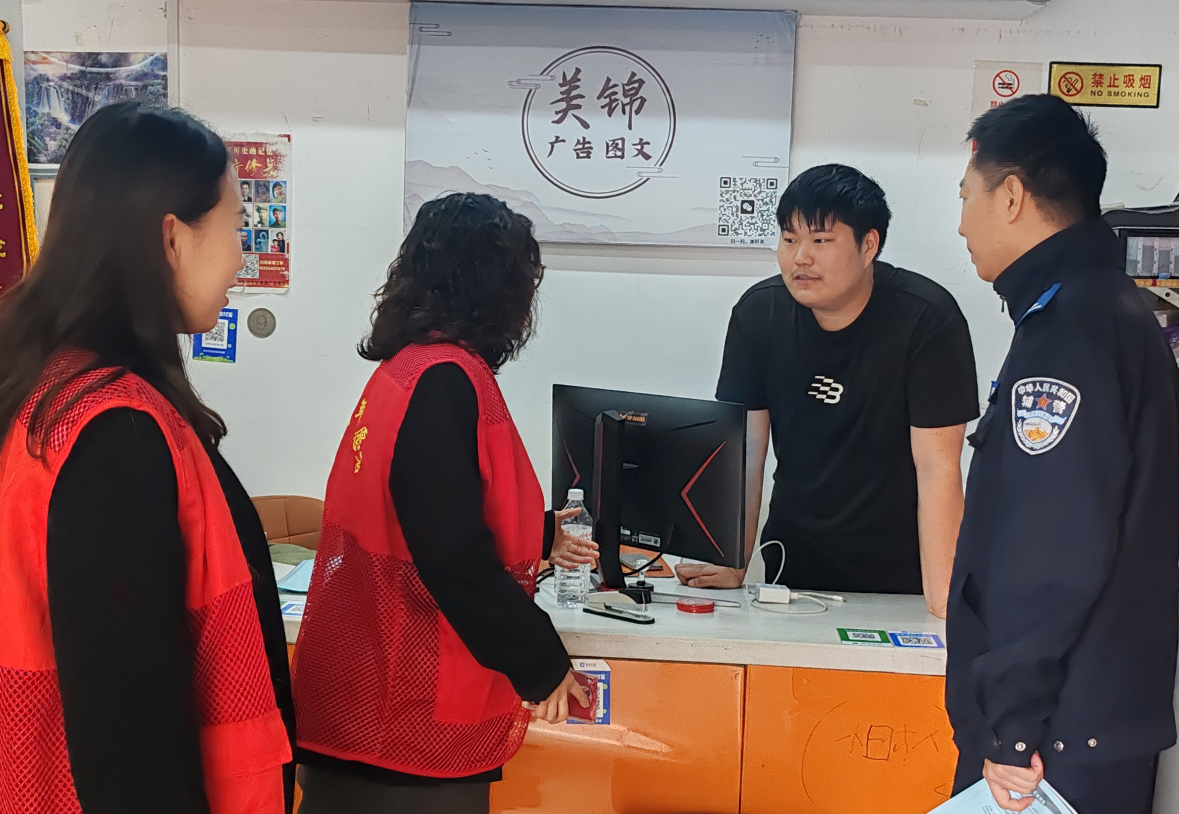 在文印店,社区工作人员与民警不仅向经营者细致讲解“扫黄打非”的核心要求,提醒其坚决拒绝非法出版物、侵权盗版资料的印刷业务,还同步开展普法宣传—— 针对文印行业易涉及的版权侵权、违规印刷等法律风险,明确告知违法违规行为的严重后果,普及反邪教知识,警示经营者警惕各类邪教宣传品的印刷需求,若发现可疑内容需及时向相关部门上报。