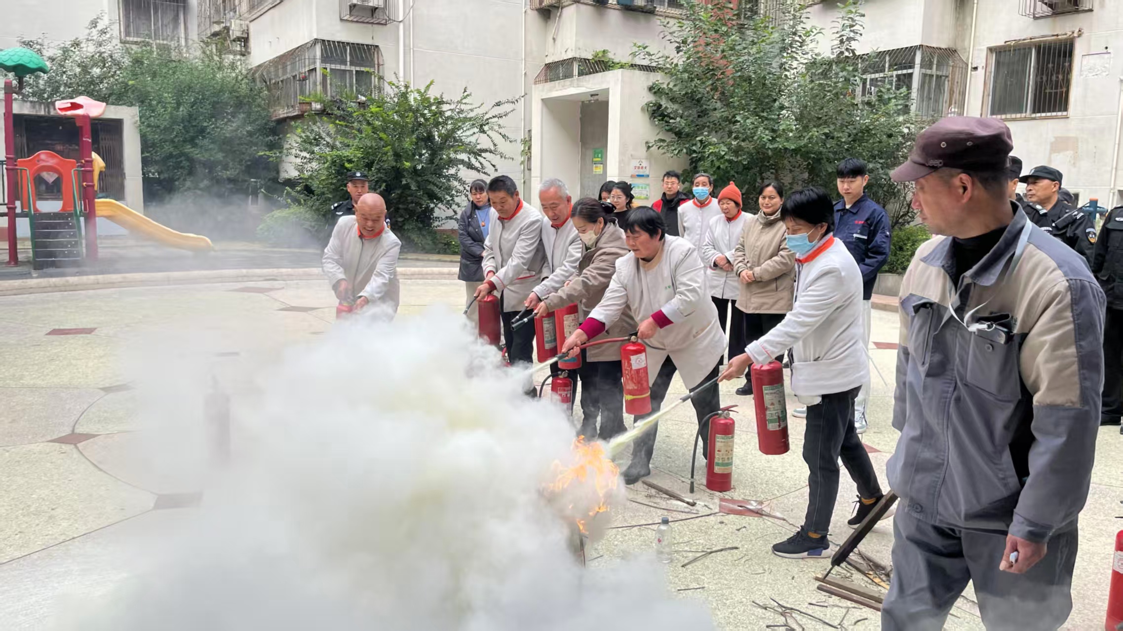 理论培训结束后,实战演练环节随即展开。在火灾扑救体验区,小区物业和居民轮番上阵,手持灭火器对准 “火点” 实战灭火,消防宣传员在旁手把手指导,纠正动作偏差,确保每个人都能 “学得会、用得上”;另一边,随着模拟火灾警报响起,疏散逃生演练正式启动,居民们在物业负责人的引导下,用湿毛巾捂住口鼻,弯腰低姿沿安全通道快速有序撤离至小区空旷地带,整个过程紧张有序,仅用时 3 分钟便完成全部疏散。