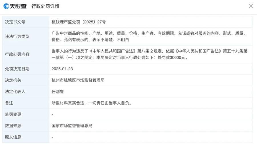 天眼查显示,今年1月,因广告中对商品的性能、产地、用途、质量、价格、生产者、有效期限、允诺或者对服务的内容、形式、质量、价格、允诺有表示的,表示不清楚、不明白,杭州匠泽电子商务有限公司被杭州市钱塘区市场监督管理局罚款3万元。