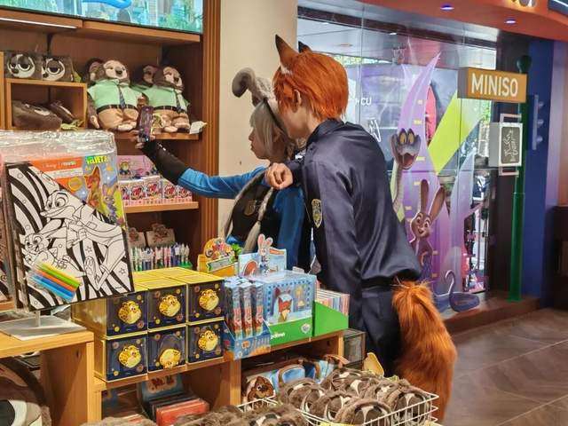 正式开业当天,暹罗广场早已沉浸在一片万圣节的热闹氛围。步行街内废弃教堂、血色植物乐园的主题街景和大量装扮成吸血鬼、狼人、丧尸巡游的coser中,突然出现了不少朱迪和尼克的身影。作为名创优品的主推IP之一,本次MINISO LAND泰国店包含了大量《疯狂动物城》系列的新联名首发。搪胶毛绒、痛包、拖鞋、玩偶等全新周边吸引了不少IP粉丝和达人前来购买。