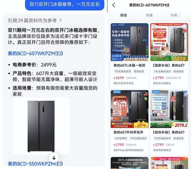 以美的BCD-607WKPZM(E)为例,豆包标明电商参考价为2499元。但点击链接后,映入眼帘的是不同抖音店铺的美的冰箱,价格大都为2799元;用户需要再次点击、进入商品详情页,才能看到叠加平台券和国补后的价格。