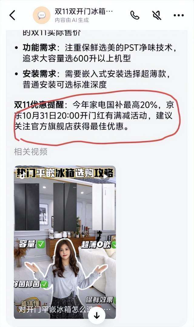 此外,豆包还给出了不同预算区间的选购建议,并在双11优惠提醒中特别提到,今年家电国补最高20%。它还配上了抖音的一则“热门平嵌冰箱选购攻略”短视频。
